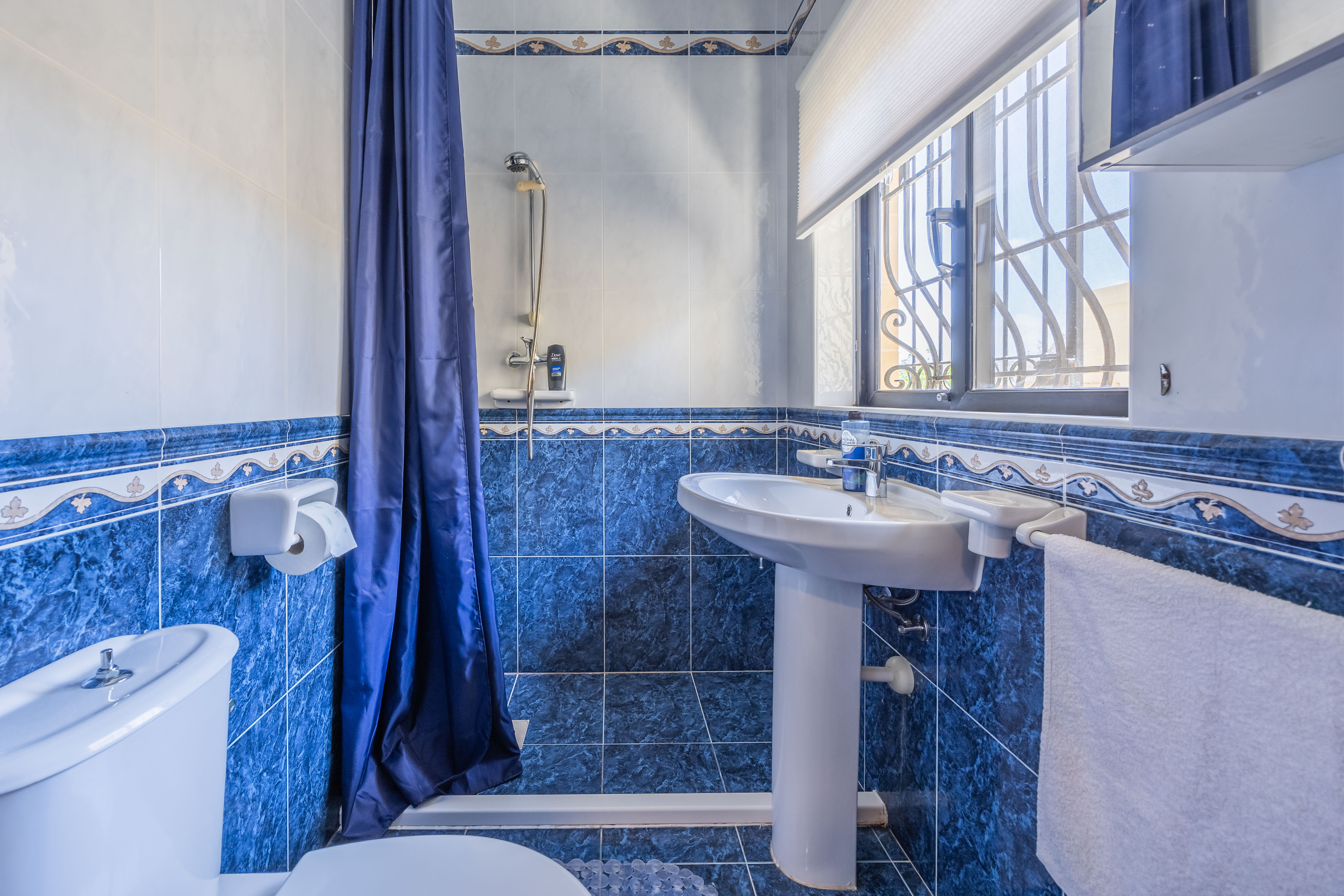 Master bedroom with en suite toilet and shower. Double bed, built in wardrobes with mirror, television and air conditioning.